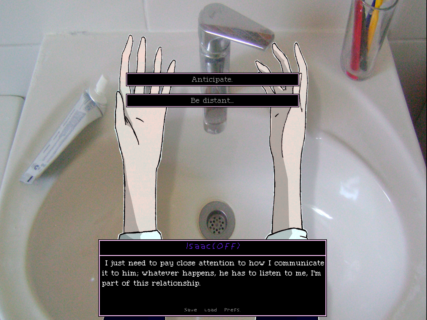 This visual novel follows Isaac, a young man lost in thought, as he prepares to face a decision he's been avoiding but must confront. Through internal monologues, fragmented memories, and tense conversations, we journey through this story about love.